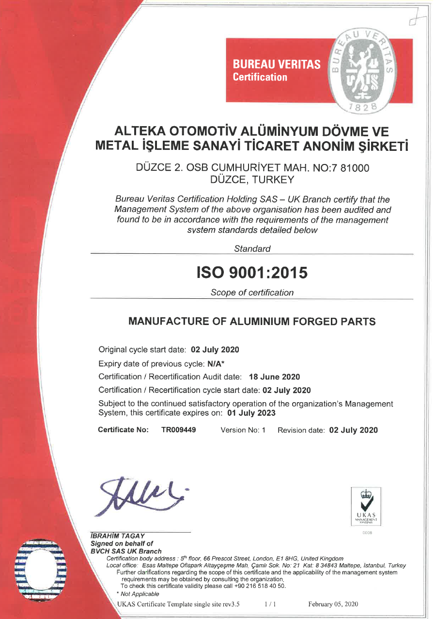 Alteka has ISO 9001 certificate as a quality system. TS 16949, ISO 14001 and OHSAS 18001 certification studies are continuing.